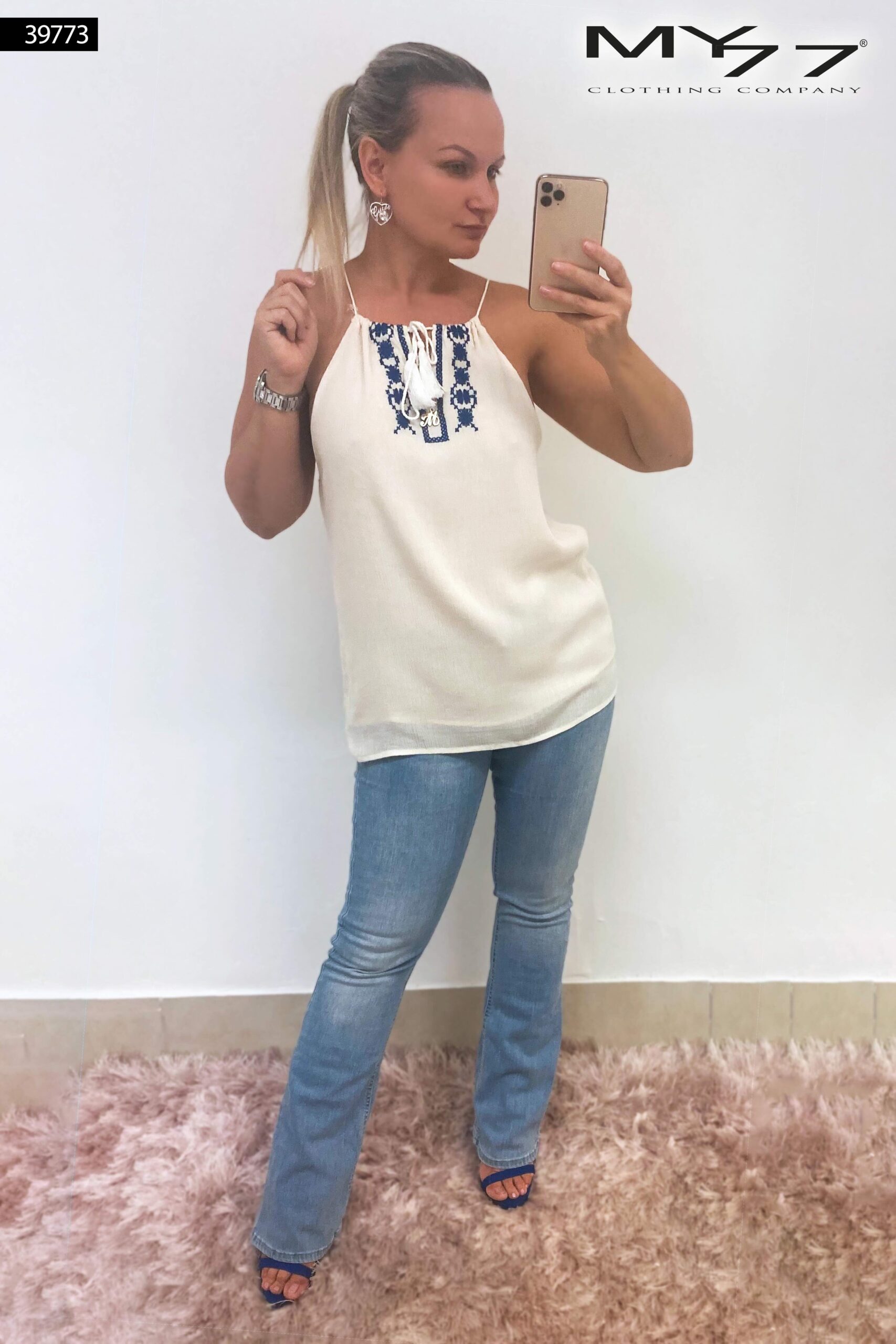 Friss, nyárias és természetes – ez a fehér top azonnal feldobja a megjelenésed! A mellrészen elhelyezett sötétkék hímzés és a romantikus bojtok különleges, etno hangulatot kölcsönöznek a darabnak. A lenge, vállpántos szabás miatt tökéletes választás melegebb napokra, de rétegezve is jól működik.
