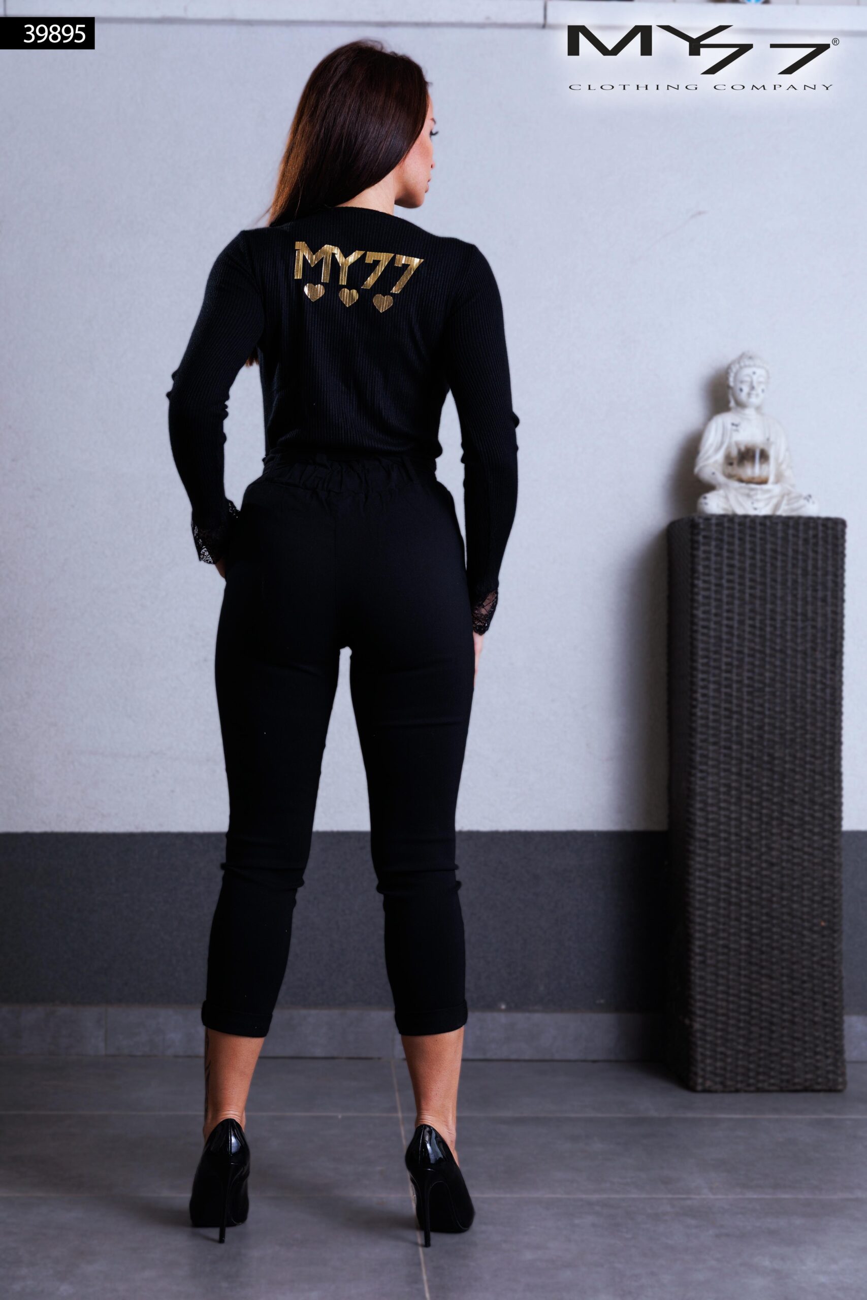 Ez a fekete MY77 felső a nőies elegancia és a modern letisztultság tökéletes kombinációja. A nyakkivágásnál és az ujjaknál elhelyezett csipkebetétek kifinomult részleteket kölcsönöznek, miközben a testhez simuló szabás kiemeli az alakot. Hátul arany MY77 logó díszíti, amely luxus hatást sugall. Ideális választás esti programokra, elegáns vacsorákra vagy alkalmi eseményekre.