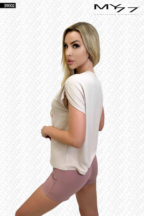 Ez a púderes árnyalatú, rövid ujjú felső a nőiesség és a pozitív életérzés tökéletes megtestesítője. A középen elhelyezett virágminta és motiváló angol nyelvű felirat (“So many beautiful reasons to be happy”) stílusosan emeli ki a felső egyediségét. A finoman húzott vállmegoldás és az ejtett szabás lezser, mégis nőies megjelenést kölcsönöz.