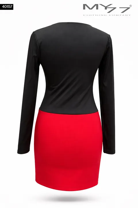 Igazi statement darab: a MY77 40157 ruha a nőies elegancia és a határozott megjelenés tökéletes egyensúlya. A felső részen fekete, drapírozott kialakítás mély V-nyakkivágással hangsúlyozza a dekoltázst, középen látványos arany díszmedállal. Az alsó rész élénk piros színe izgalmas kontrasztot ad, miközben a testhez simuló szabás gyönyörűen formálja az alakot.