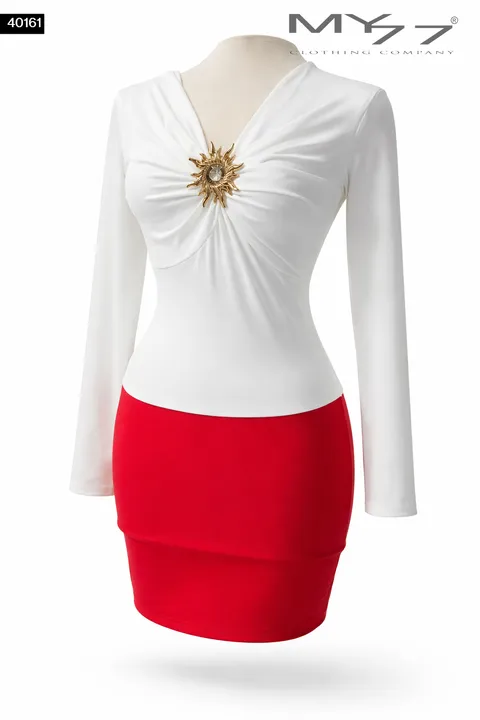 Igazi statement darab: a MY77 40157 ruha a nőies elegancia és a határozott megjelenés tökéletes egyensúlya. A felső részen fekete, drapírozott kialakítás mély V-nyakkivágással hangsúlyozza a dekoltázst, középen látványos arany díszmedállal. Az alsó rész élénk piros színe izgalmas kontrasztot ad, miközben a testhez simuló szabás gyönyörűen formálja az alakot.
