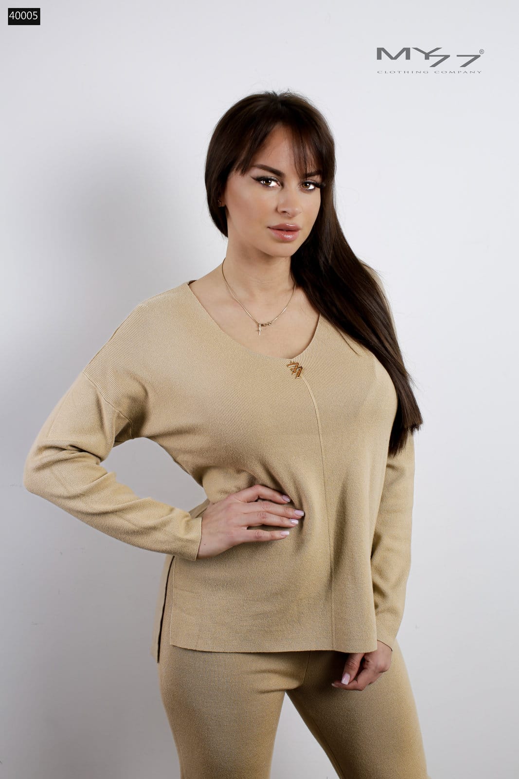 MY77 – Bézs kötött szett: V-kivágású felső
