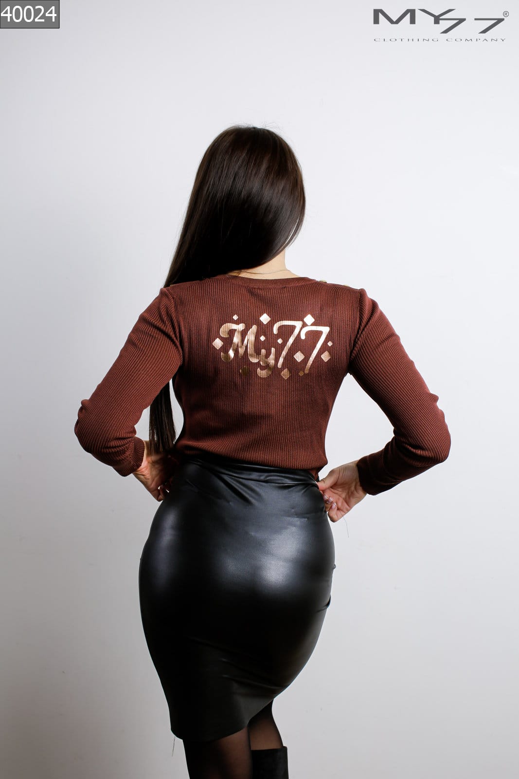Ez a MY77 két részes bordó-fekete szett tökéletes választás azoknak, akik szeretik az elegáns, mégis nőies összeállításokat. A bordó bordázott felső arany gombokkal és hátul MY77 logóval díszített, míg az alsó rész fényes, testhez simuló bőrhatású ceruzaszoknya, amely kiemeli az alakot.