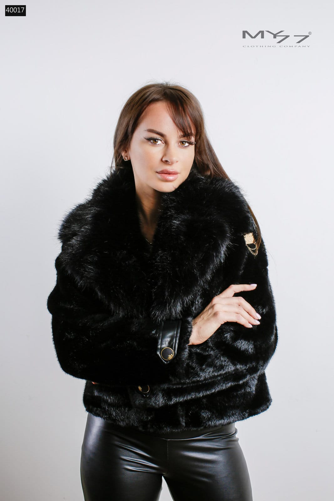Luxus-hatás, puhán melegen. Rövid, boxy fazonú fekete műszőrme bunda nagy, látványos gallérral. Puha tapintású, fényes felület; aranyszínű gombok és csatos mandzsetták adják a glam érzetet. A karon diszkrét MY77 jelvény, elöl rejtett zsebek – stílus és praktikum egyben.
