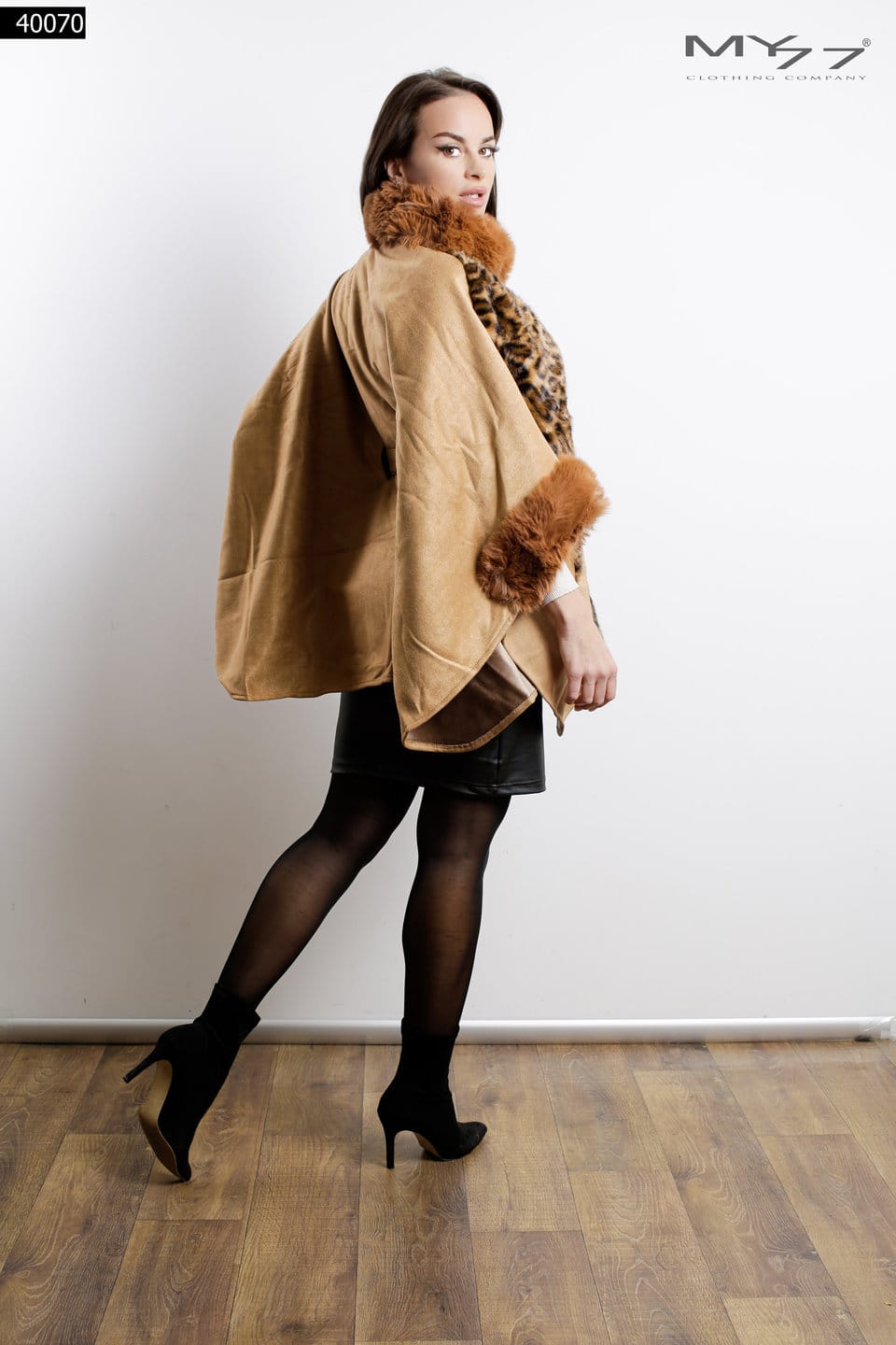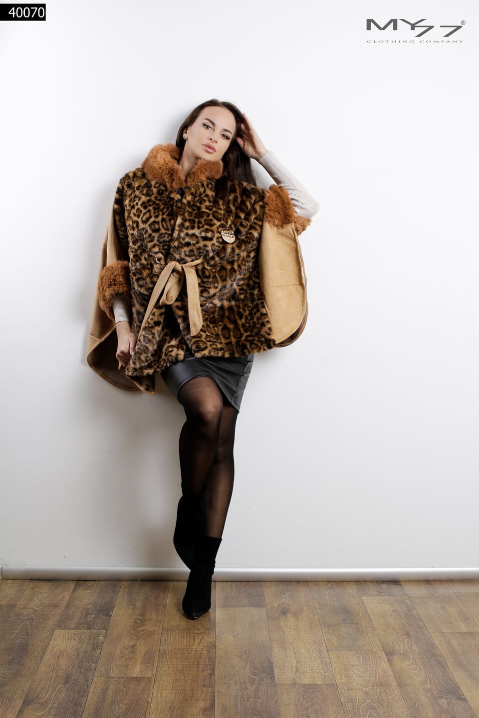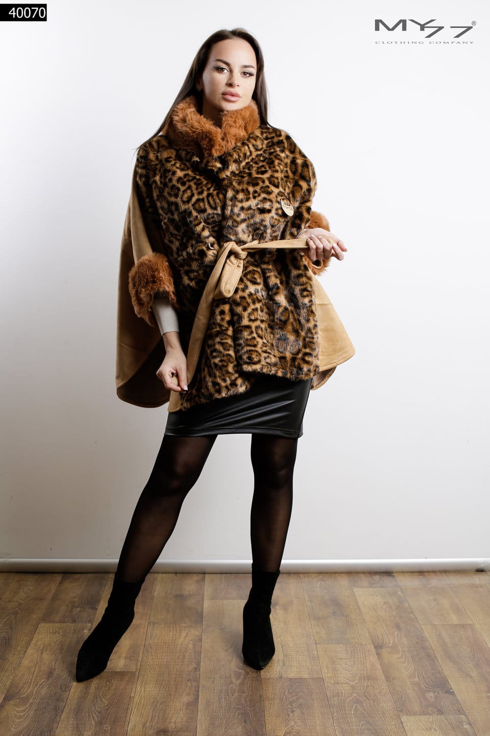 MY77 Leopárdmintás, műszőrme galléros poncsó – 40070