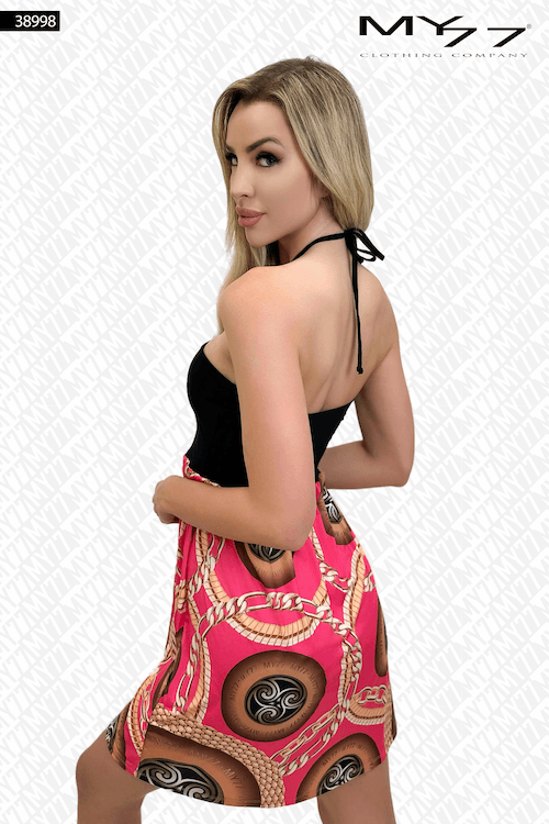 Ez a könnyed és trendi nyári miniruha ideális választás a meleg napokra. A fekete, pánt nélküli felsőrész egyszerű eleganciát sugároz, míg az élénk piros mintás szoknyarész játékos és figyelemfelkeltő hatást kelt. A derékrészen húzott megkötő gondoskodik a kényelmes, alakhoz igazítható viseletről.